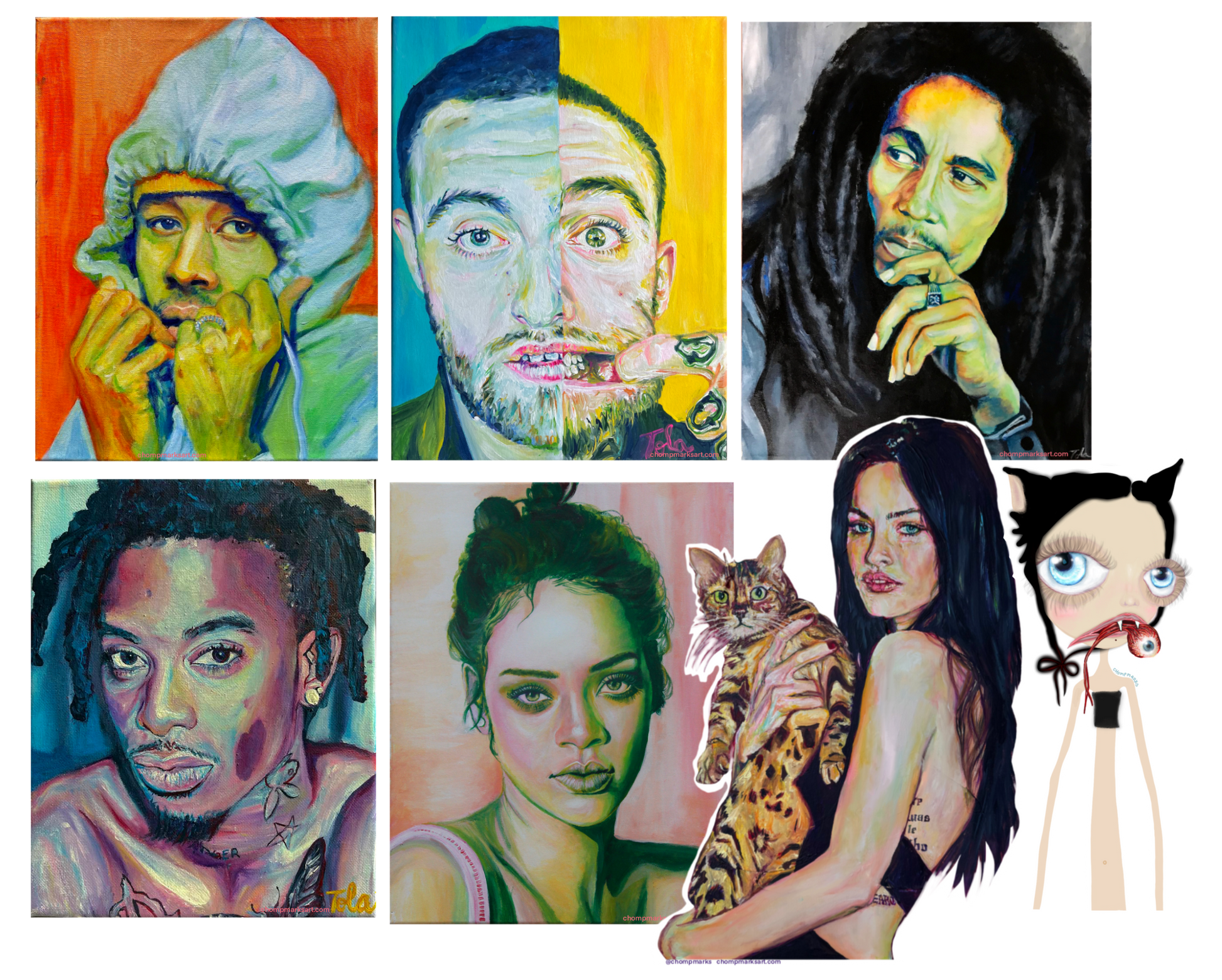 This pack contains a variety of stickers, printed on glossy, white vinyl sticker paper. Stickers come custom cut and cropped and vary in size, depending on original artwork, from about 1.25-2.5 inches in width to about 3-4 inches in height.